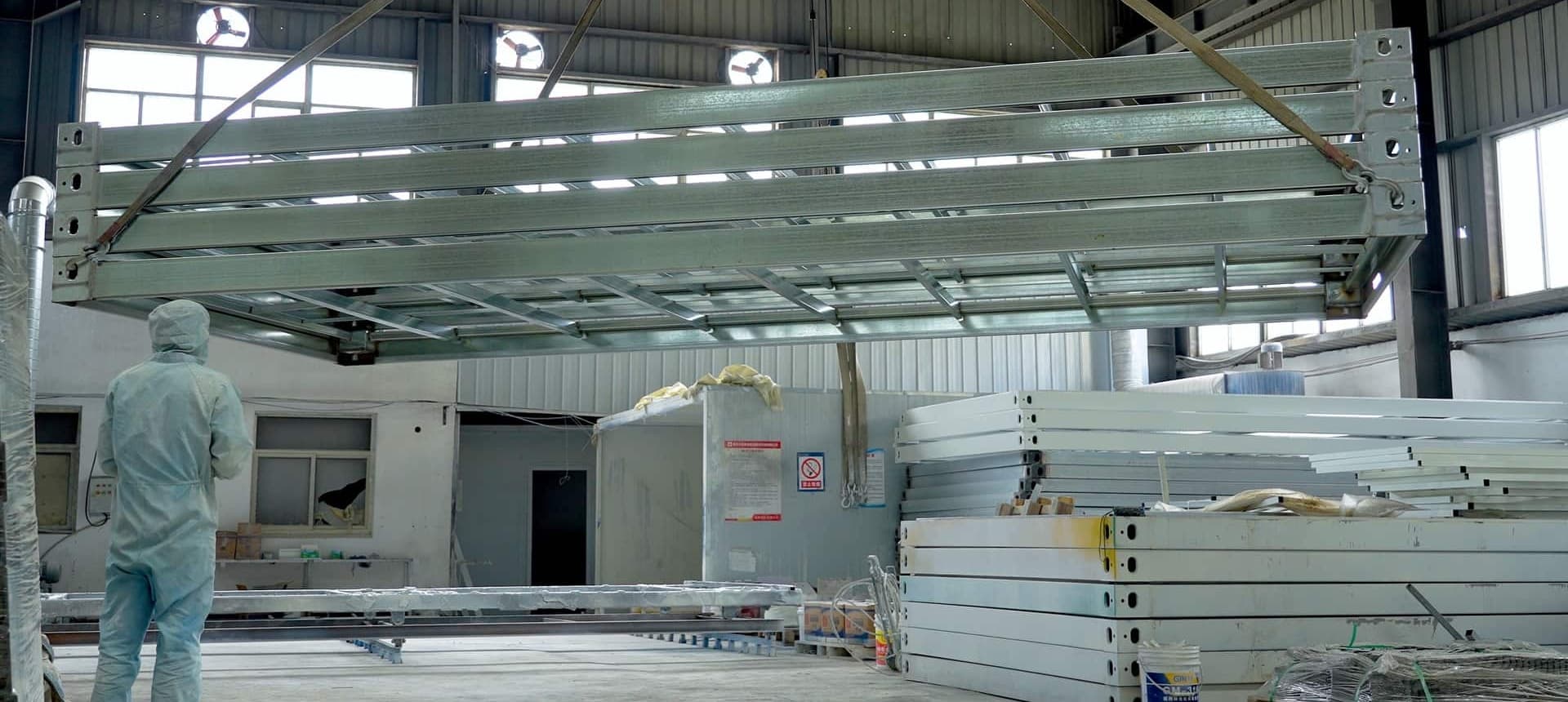 Kết cấu thép nhẹ/thùng chứa + tấm panel: Khung cơ bản thường bao gồm khung thép mạ kẽm với các tấm composite phủ màu hoặc tấm panel dạng sandwich làm tường, mang lại độ bền, khả năng chống gió, chống ăn mòn, cách nhiệt và cách âm.