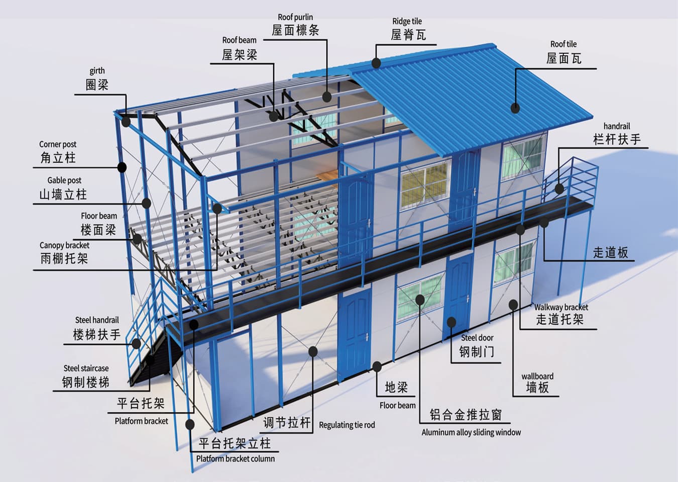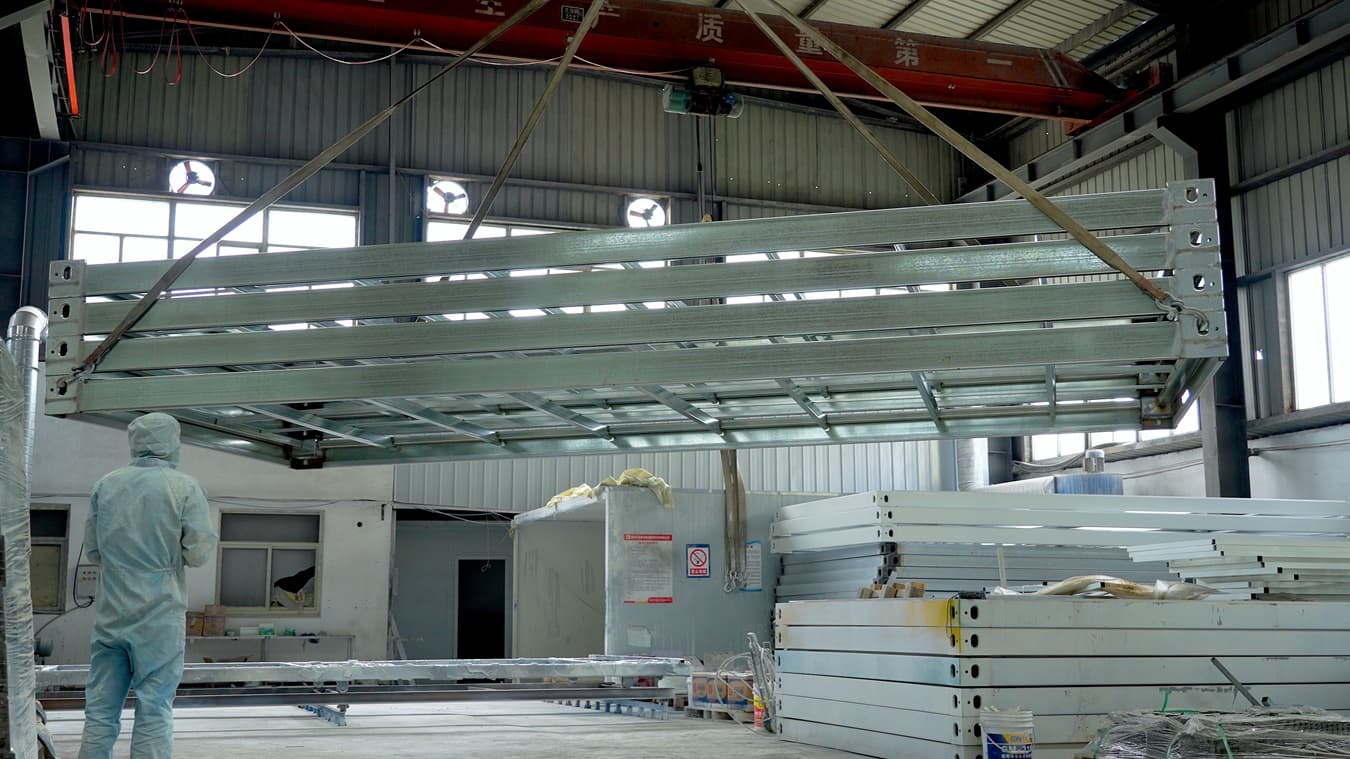 MỘT:Bộ khung chính được làm bằng thép hình chữ C/U mạ kẽm cường độ cao; Tấm ốp tường bao quanh là tấm ốp bánh sandwich và vật liệu lõi có thể được lựa chọn từ len đá và polyurethane.